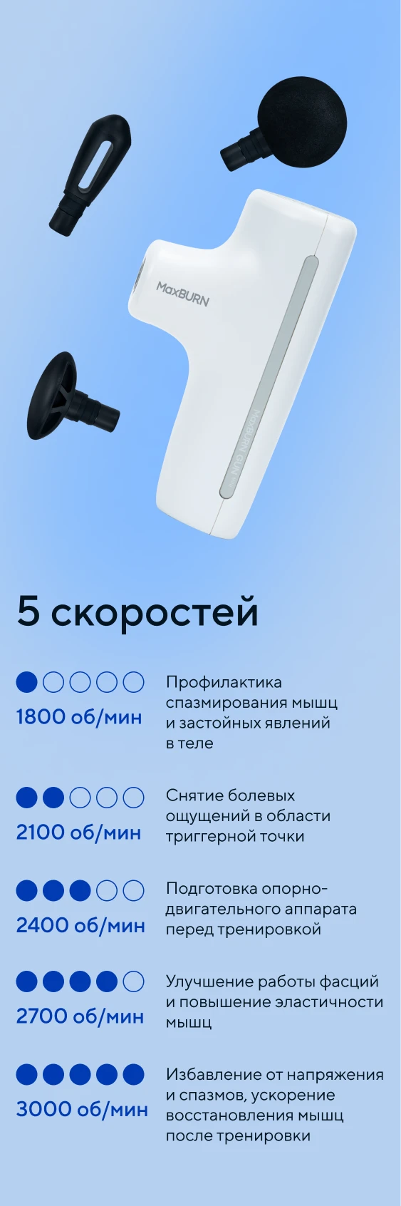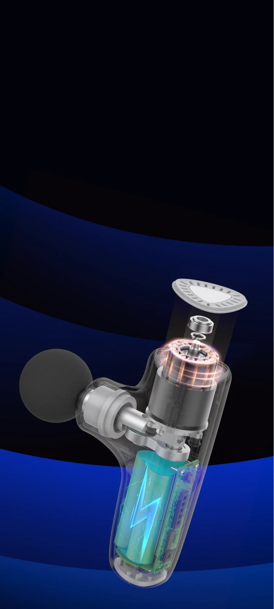 Заряда аккумулятора хватит до 30 сеансов массажа, если MaxBurn GUN mini использовать один раз в день в течение 10 минут на первом уровне скорости.