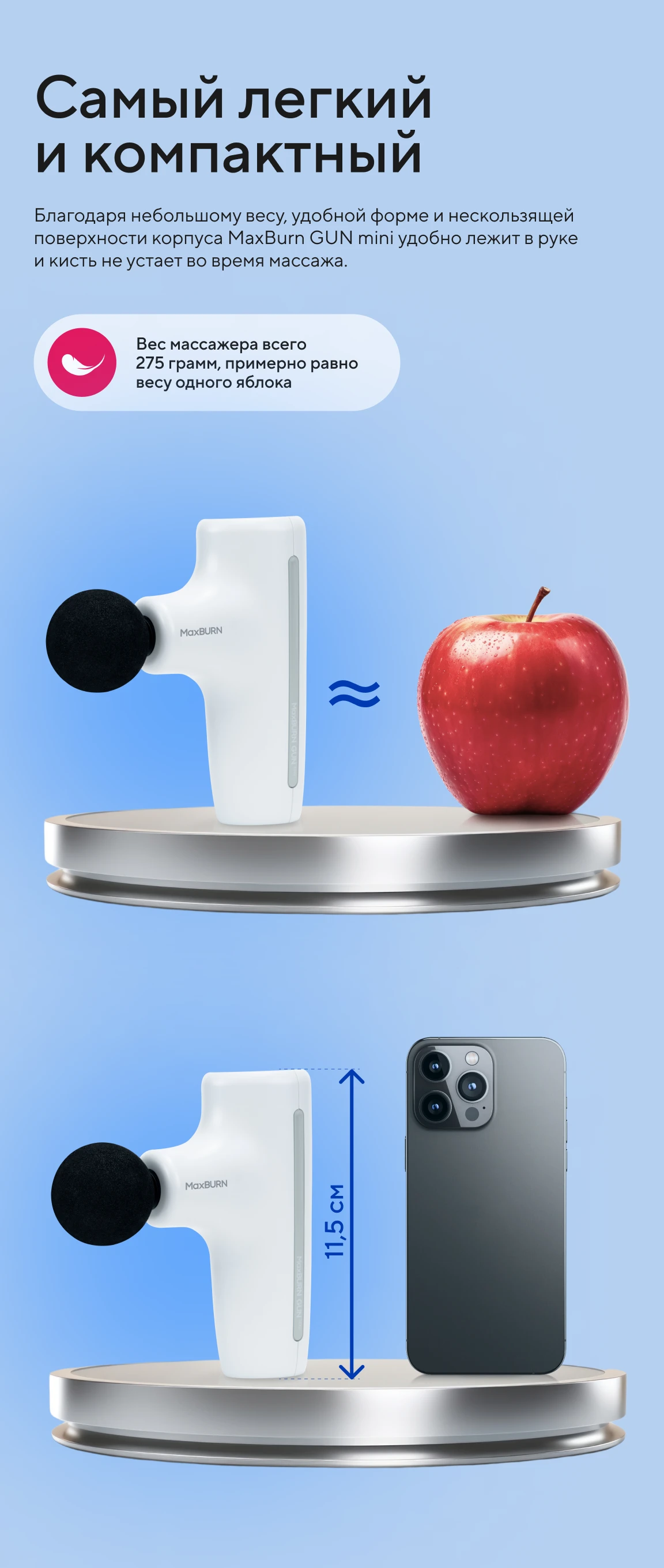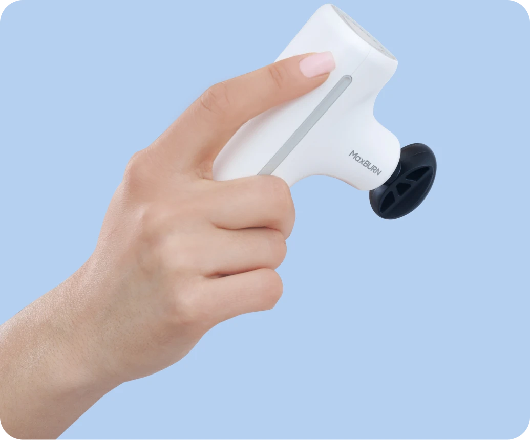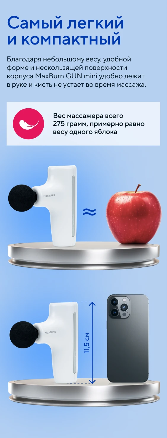 MaxBurn GUN mini удобно держать в руке благодаря маленькому весу и тактильно приятной нескользящей поверхности корпуса